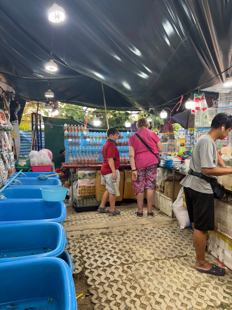 We have come to terms that Thai people love two things: markets and food. This event was simply pushing them both together. We journeyed down a kilometer (half a mile…ish) market, which hosts every imaginable assortment of food and beverages. It also hosts things like birds, small rodents, and even fish that you could call your pet and bring home with you. Though not specifically at this market, we did see things like giant tortoises in tubs and even meerkats for sale to the general public. It is wild.