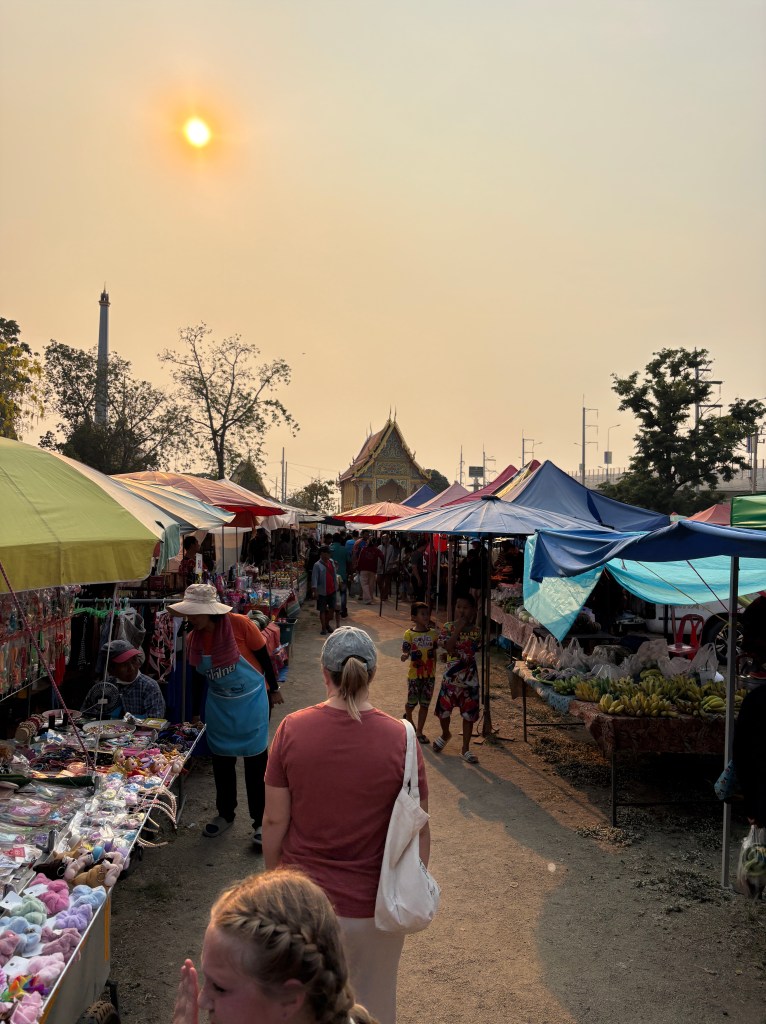 TGIF, get out of the way. Here in Manorom, Wednesdays are the night to remember. Every Wednesday, just down the road and right past our one stoplight, they host a massive market right outside a temple to Buddha. There are all manner of fresh fruits, vegetables, and meats (raw and cooked), along with random stalls selling everything from toys to purses. This is where the city gathers, the heartbeat of the community and we are there. I think that biking/walking down to be among the people and filling our baskets and bags with nutritious food and one too many sweets is the start of a new tradition, a single act of consistancy and sign of finding a new place to call our own (for a while).